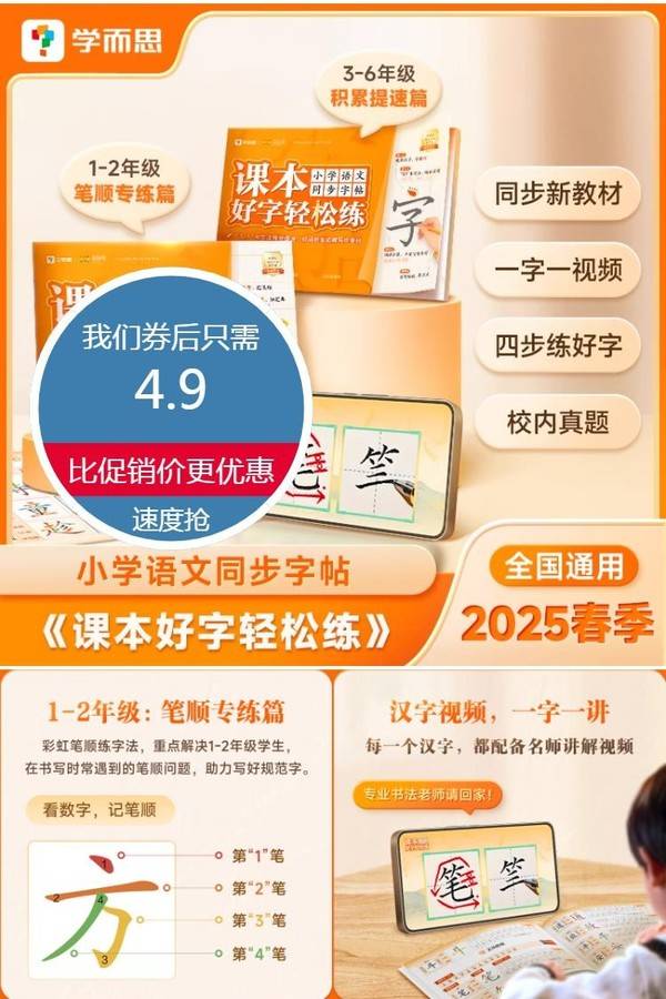 【2025版】学而思课本好字轻松练 小学语文同步字帖 一二三四五六年级人教版字帖一笔一练真题检测易错笔顺不出错记笔顺正版-CB 学而思网校官方旗舰店 普通活动 销量:200 【2025版】学而思课本好字轻松练 小学语文同步字帖 一二三四五六年级人教版字帖一笔一练真题检测易错笔顺不出错记笔顺正版-CB 【赠书写检测卡】2025版学而思课本好字轻松练,同步新教材,一课一练,一字一视频,四步练好字,校内真题,分级书写方案,精.准解决不同问题! 券后价4.90 限时活动 原价5.90 复制口令 前往购买 购物就到券老哥,超多实惠享不停 营销计划 轮播图(可左右滑动) 可设置图片简介 详情图 本站地址http://qlg.zskdy.cn/(防失联) THE END 说明 【声明】本站只提供信息展示,购物信息链接到第三方平台,所有交易均在第三方平台发生,与本站无关。 【合作】商合作联系邮箱yylewl@qq.com!