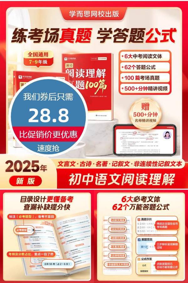 学而思新版 初中语文阅读满分系列 阅读理解有公式 答题公式答题模板技巧专项训练 初中通用备战中考语文必刷题模板训练-WX 学而思网校官方旗舰店 普通活动 销量:6000 学而思新版 初中语文阅读满分系列 阅读理解有公式 答题公式答题模板技巧专项训练 初中通用备战中考语文必刷题模板训练-WX 【淘金币抵扣更优惠】学而思新版初中语文阅读满分系列,6大中考阅读文体,62个答题公式,100篇考场真题,500+分钟精讲视频,学公式稳拿分,刷真题稳提分!练考场真题,学答题公式! 券后价28.80 限时活动 原价52.80 复制口令 前往购买 购物就到券老哥,超多实惠享不停 营销计划 轮播图(可左右滑动) 可设置图片简介 详情图 本站地址http://qlg.zskdy.cn/(防失联) THE END 说明 【声明】本站只提供信息展示,购物信息链接到第三方平台,所有交易均在第三方平台发生,与本站无关。 【合作】商合作联系邮箱yylewl@qq.com!