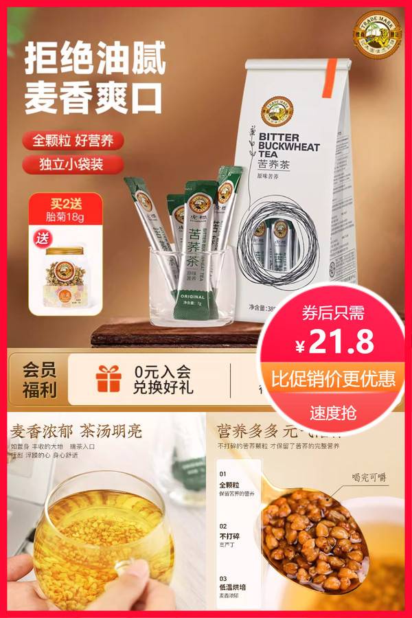 香港虎标苦荞茶385g内含55小包全颗粒苦荞四川凉山全胚芽荞麦茶包 虎标旗舰店 普通活动 虎标 销量:40000 香港虎标苦荞茶385g内含55小包全颗粒苦荞四川凉山全胚芽荞麦茶包 大凉山黑苦荞茶,产品升级,加量不加价,独立包装7g/55袋*2件,卫生又方便携带,麦香浓郁,轻食健康,粒大饱满!,含有多种微量元素,茶汤汤色明亮,干吃醇厚脆爽~ 券后价21.80 限时活动 原价29.80 复制口令 前往购买 购物就到券老哥,超多实惠享不停 营销计划 轮播图(可左右滑动) 可设置图片简介 详情图 本站地址http://qlg.zskdy.cn/(防失联) THE END 说明 【声明】本站只提供信息展示,购物信息链接到第三方平台,所有交易均在第三方平台发生,与本站无关。 【合作】商合作联系邮箱yylewl@qq.com!