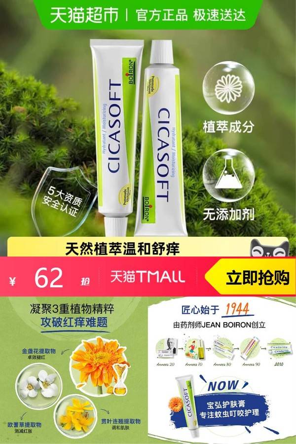 Boiron宝弘金盏花护肤膏30g小绿管儿童蚊虫叮咬舒缓止痒温和修复 天猫超市 聚划算 销量:10000 Boiron宝弘金盏花护肤膏30g小绿管儿童蚊虫叮咬舒缓止痒温和修复 【淘金币4.92,淘礼金5.76,政府补贴7%,到手价47.73,88VIP用户到手价45.34】金盏花护肤膏,犹如金秋之日的秘密配方,以植物力量守护你的肌肤,温和的质地,一触即化,滋养您的肌肤至深层次。 券后价62.00 限时活动 原价82.00 复制口令 前往购买 购物就到券老哥,超多实惠享不停 营销计划 轮播图(可左右滑动) 可设置图片简介 详情图 本站地址http://qlg.zskdy.cn/(防失联) THE END 说明 【声明】本站只提供信息展示,购物信息链接到第三方平台,所有交易均在第三方平台发生,与本站无关。 【合作】商合作联系邮箱yylewl@qq.com!